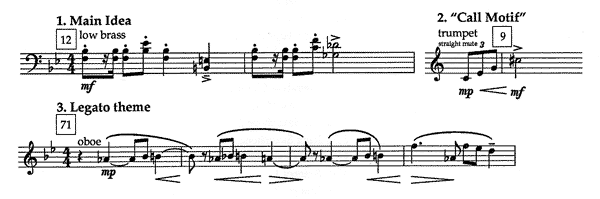 Section III (measures 71 - 107): The "legato theme" is developed through several keys, and the entire section builds gradually from piano to fortissimo. The "main idea" is recalled at measures 83 - 87 (trombones/euphonium) and at measures 96 - 99 (trumpets/horns), but it is always subordinate to the "legato theme." At measures 100 - 106, the "legato theme" is passed from group to group, but it is always marked "bring out."